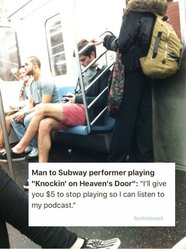 He straight up offered the musician $5 to stop playing so he could listen to his podcast. Boring! We’re not sure if anyone else on the train agreed with this man, but listening to a podcast doesn’t sound nearly as entertaining. Also, he was only offering $5, which is basically pennies in New York, so who knows if this musician even took him up on the offer.